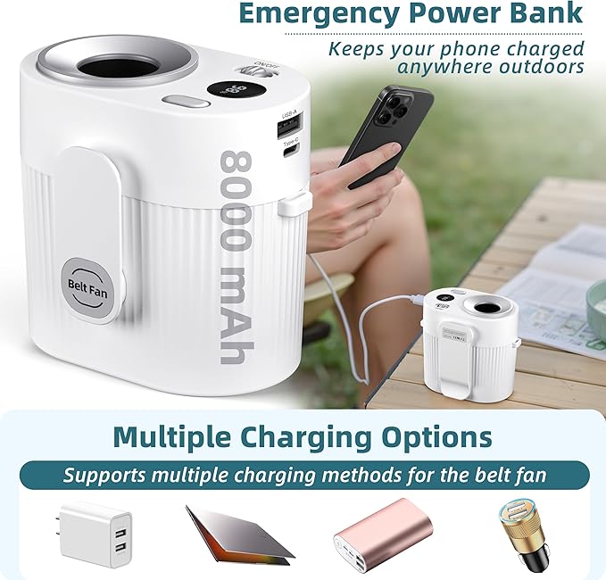 - 14h Working Time & Emergency Power: The rechargeable 8000mAh high-capacity belt clip fan provides 4–14 hours of continuous cooling (varies by speed) and doubles as an emergency power bank, charging your phone via the USB-A output port (5V/2A)