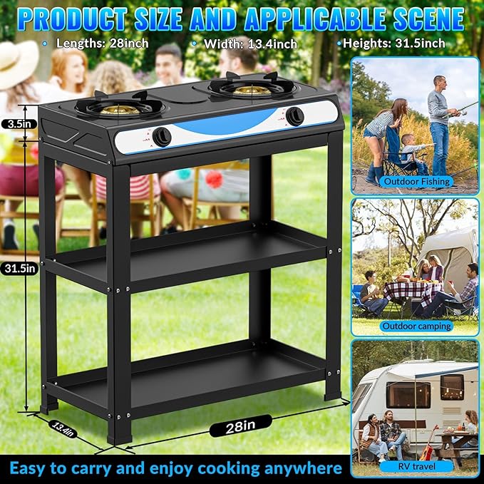 - 【Gas Stove Dimensions】 - This black gas stove measures 28"L x 13.4"W x 3.5"H, with sturdy legs standing at 31.5"H. Designed with two burners, it provides a stable surface for pots and pans. Plus, the built-in placement board offers convenient storage for fruits, vegetables, and other essentials. Gather your friends and family to cook together and enjoy a delicious feast.