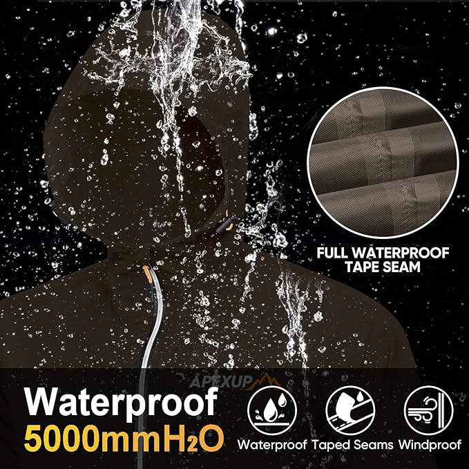 - Waterproof and Windproof: APEXUP men's rain jacket is made from tear-resistant, high-density polyester with waterproof zippers; It features a premium waterproof coating and hot-pressing sealed seams, ensuring a 5000-8000mm waterproof rating to keep you dry in any weather