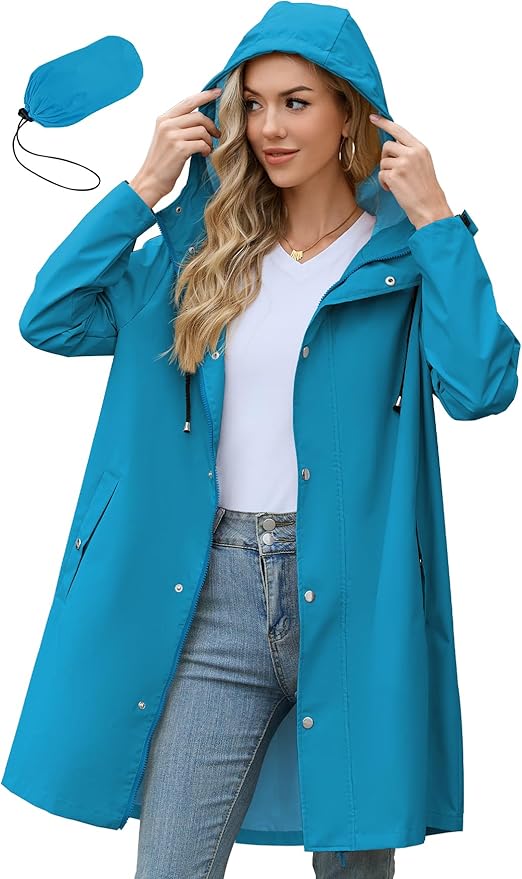 Zando Long Packable Rain Jacket Women Waterproof - Raincoat for Women Rain Coat with Hood Lightweight Outdoor Windbreaker