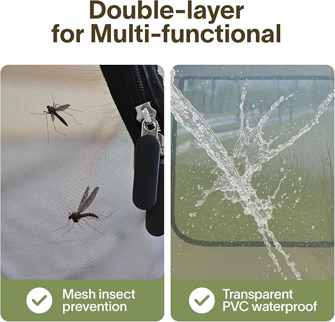 - All-Weather Ready: Built for all four seasons, this pop up tent shields you from rain, wind, and insects. Use the mosquito-proof mesh for breezy backyard lounging or rely on the waterproof PVC layer for storm protection—versatility meets durability. And the built-in fabric side doubles as a sunshade sail—no extra purchase needed! Block sunlight, prevent sunburn, and enjoy added privacy.