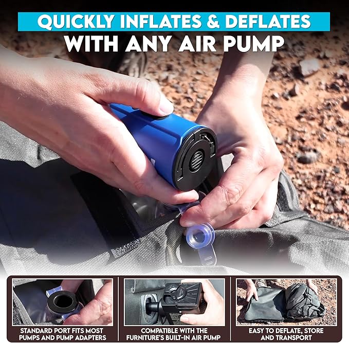 - Quick Inflation: Easily inflate this outdoor pouf ottoman in under two minutes, compatible with most air pumps, including the detachable pumps our Inflatable Furniture set. Deflates quickly for compact storage & is ideal for indoor & outdoor use