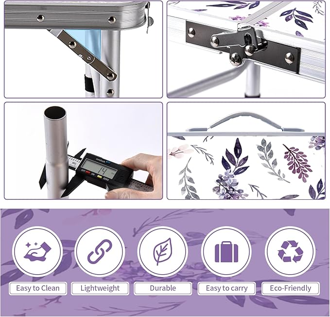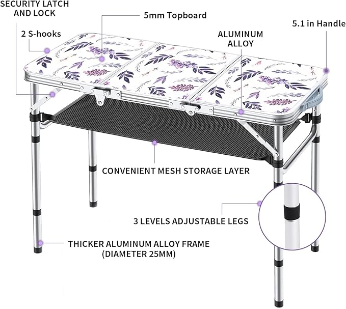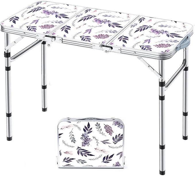 Folding Camping Table 3ft Portable Pinic Table Adjustable Height Small Card Table Aluminum Foldable Lightweight with Carry Handle for Outdoor Indoor Hiking Camp BBQ Beach (Misty Lilac)
