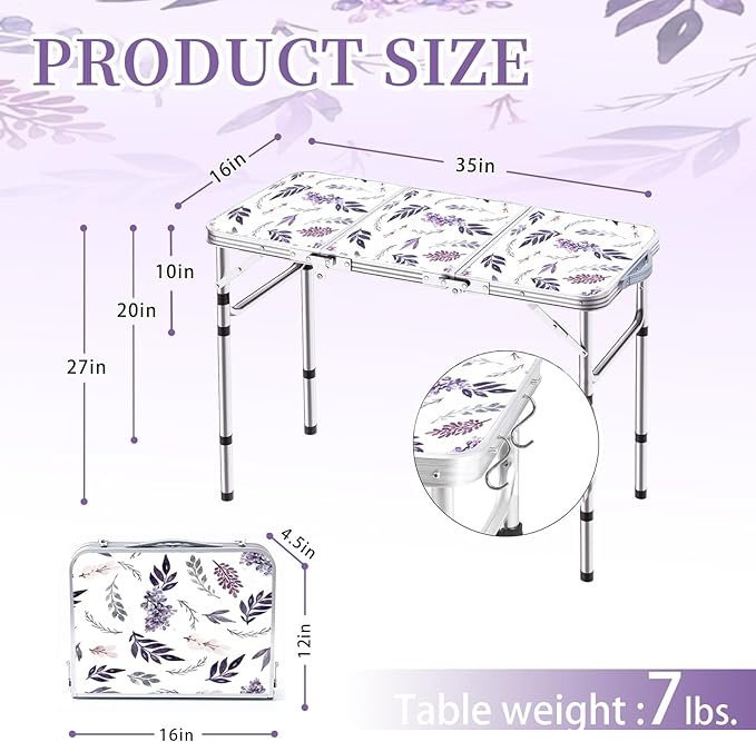 - Adjustable Heights:This small portable table open size is :35 "x 16 ", Adjustable legs offer 3 heights: 10 ", 20 ", 27 ".Folded size is 16 "x12 "x4.2 " when folded in half.Easily adapt the table to your needs and enjoy the flexibility it provides