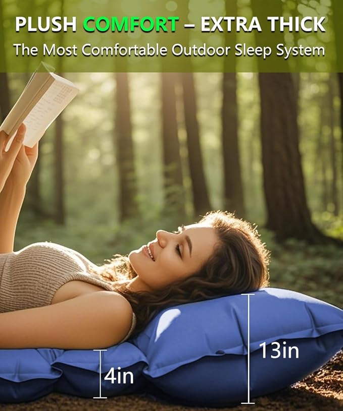 - 【3-inch Thickened Sleeping Support】The 2025 upgraded camping self-inflating pad is up to 78*27*3 inches in size, and can keep you away from uneven ground and hard rocks after inflating. The innovative egg-shaped airbag and built-in pillow are designed to relieve back and neck pressure.