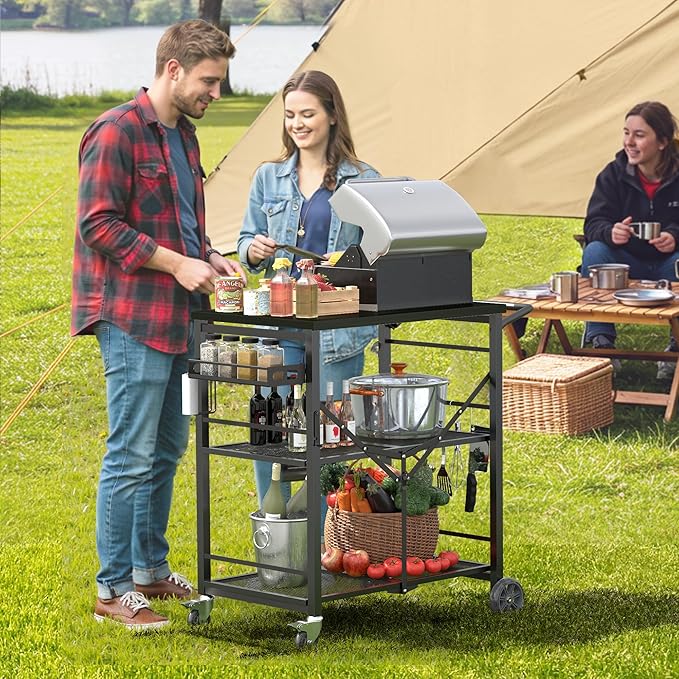 - 【Stable and Sturdy】The grill cart features a reinforced support frame with a secure locking mechanism that prevents wobbling. Confidently hold up to 45 lbs per tier. The metal table top and mesh panels ensure lasting durability. Two of the wheels include a locking function to keep the cart securely in place, even on slopes
