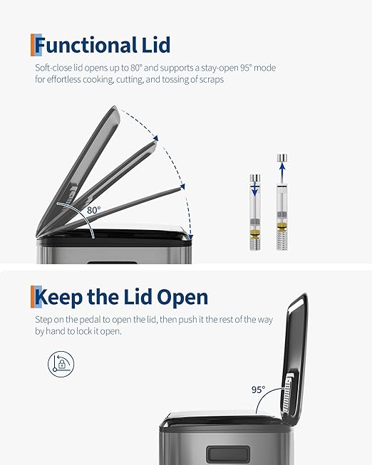 - [PRACTICAL DESIGN] – GarveeHome’s dual trash and recycling bins put ease of use first. Ergonomic side handles let you lift and relocate the entire unit effortlessly. The soft-close lid opens to 80° without collision with standard kitchen island edges, and locks at 95° for hands-free cooking prep and scrap disposal. Dual inner buckets with weighted-edge lids trap odors separately. A custom liner ring secures any standard bag snugly, eliminating slips, bunching, and overhang