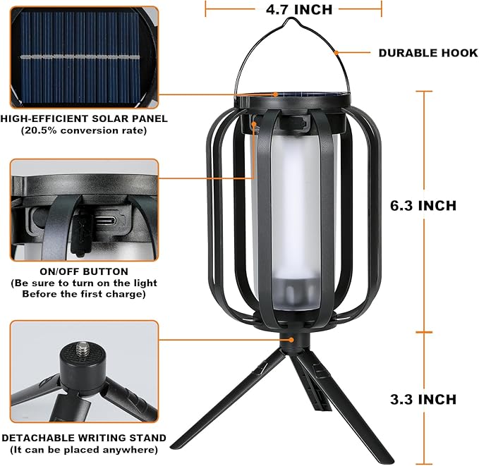 - Solar Powered & USB: Waterproof outdoor solar Lantern lights come with high-efficiency solar panel and rechargeable battery. It can light up 6-8 hours when it is fully charged. In winter, rainy and snowy weather.There is not enough sunshine, at this time you can use USB power supply, USB can be plugged in to work and can also save power, so that the lantern lights can be used at other times !!!