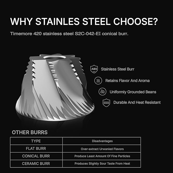 - [ Patented Burrs & 30 Precision Grind Settings ] Featuring TIMEMORE patented S2C-420-EI stainless steel octagonal burrs, The Whirly grinder is theperfect choice for those who love theclassic espresso flavor profile but alsoenjoy the occasional filter coffee. Thisburr set delivers elevated sweetness andricher crema while reducing the difficultyof pressure building during extraction,making it ideal for achieving a perfectlybalanced shot. We found that it doesespecially well with medium to dark roastsemphasizing round, integrated flavors.