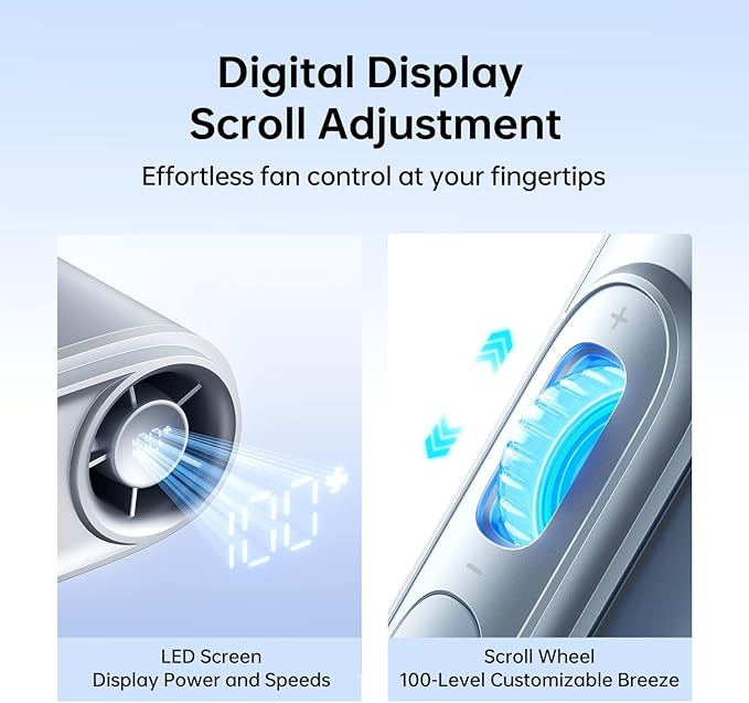 - Smart LED - Instant Adjustment: Personal fan boasts smart LED displays, real-time speed (1-100) and battery %. Short press to power on/off; double-tap for battery check. Rotate the roller up and down to adjust the air volume instantly—no fumbling! Auto-switches to speed display after 5s, between modes for gym, commute, travel