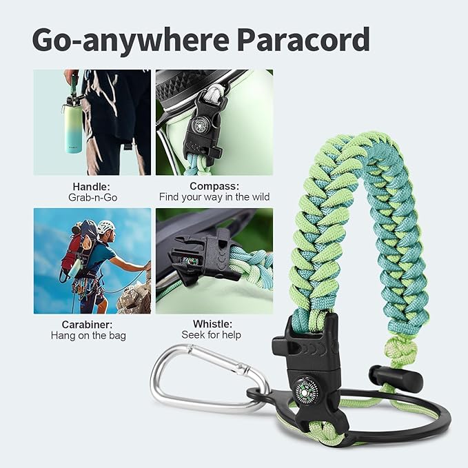- Palm Fitting Paracord Handle: Compared to handle lids, nylon paracord on the bottle gives you more choices in terms of color coordination and coziness on your hands. Match the handle with your bottle to make a complete outdoorsy look. Compass and carabiner can be lifesavers for hiking and other expeditions