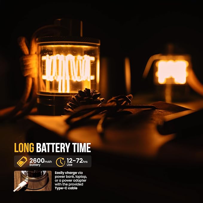 - ✅ BUILT FOR THE LONG JOURNEY - This Φ 2.36" x H 3.94", 11 oz aluminum lantern combines precision engineering with intuitive function: smooth dimming controls (3-second fade), 72-hour max runtime (2600mAh via USB-C), and IPX4 splash resistance. The perfect balance of trail-ready durability and home-friendly ambiance—whether illuminating backcountry campsites or weathering urban power outages