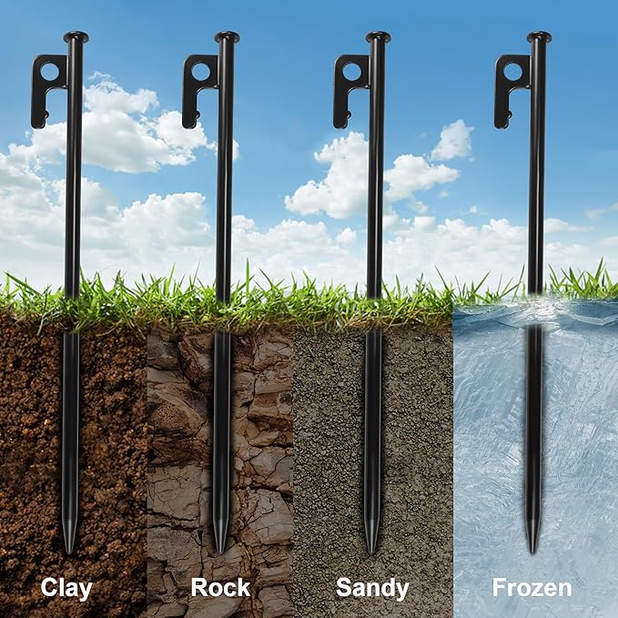 - HEAVY DUTY CAMPING GROUND STAKES: Made of high-quality forged S45C steel, completely get rid of the snapping and bending, more durable and corrosion-resistant. Available in rocky place hard soil desert snowfield and grassland