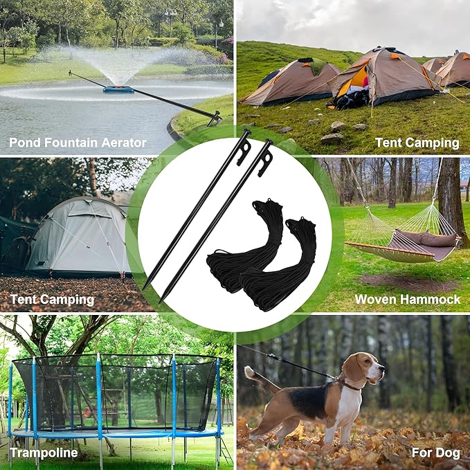 - MULTIFARIOUS USE: A must-have ground anchors & multifunction paracord for outdoor activities. Essential tool for securely anchoring camping tents, pond fountain aerator, canopies, shelters, campers, fence posts, trampolines, trees, landscape trim, or outdoor decoration, etc. It can add to your bug out gear, camping accessories, hiking, or survival tools for your next outdoor adventure