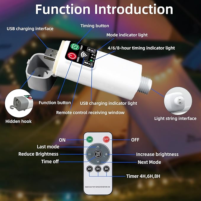 - 【8 Lighting Modes 】 Elevate your camping experience with multifunctional Remote Control with Timer Lights string. Designed for the great outdoors, Battery powered camping string lights outdoor offer 8 lighting modes for you to choose from, such as Wave, Steady, Flashing, Slow Fade and more. And can be set on a time for 4 hours, 6 hours and 8 hours. Different modes and brightness levels can be set both by remote control and Battery operated regulator for any occasion.
