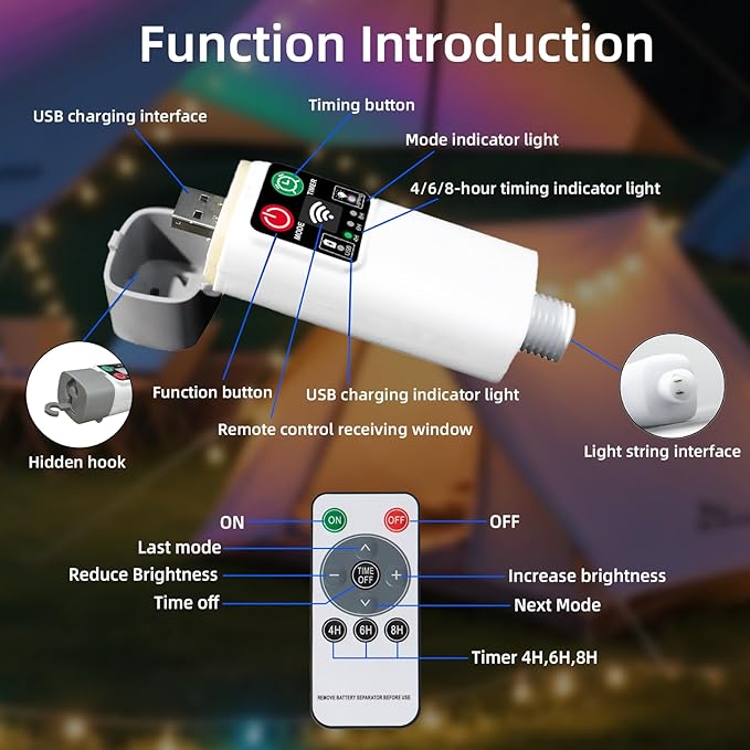 - 【8 Lighting Modes 】 Elevate your camping experience with multifunctional Remote Control with Timer Lights string. Designed for the great outdoors, Battery powered camping string lights outdoor offer 8 lighting modes for you to choose from, such as Wave, Steady, Flashing, Slow Fade and more. And can be set on a time for 4 hours, 6 hours and 8 hours. Different modes and brightness levels can be set both by remote control and Battery operated regulator for any occasion.