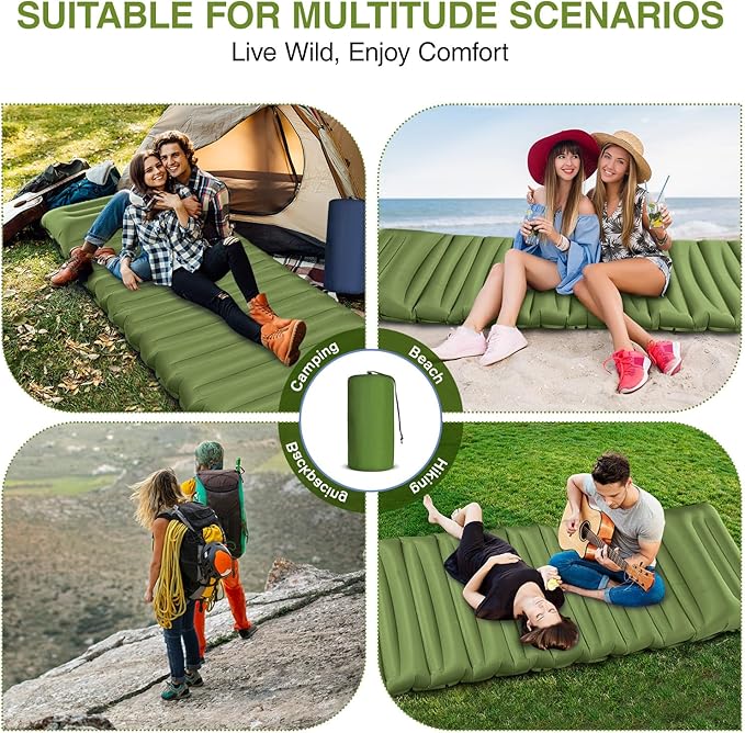 - 5” Extra Thick & Comfy Support: OUTTPLY sleeping pad measures 79 x 27 inches. After inflation, it is up to 5 inches thick, providing air support and keeping your body away from uneven ground and hard rocks. The upgraded tube-shaped design fits your hips and shoulders, allowing you to sleep comfortably in any sleeping position. Also, the built-in pillow makes your camping trip more convenient.