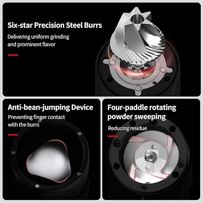 - 【Built-in Gasket】The integrated gasket acts as a protective barrier,not only preventing accidental finger contact with the grinding core, but also preventing the coffee bean from jumping.