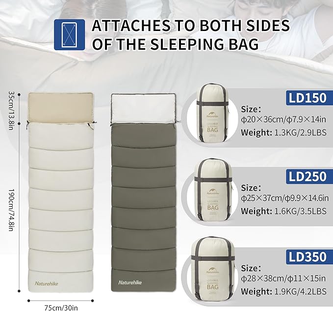 - [STAY WARM] Comfort temperatures are 12°C/ 53.6°F for the LD150 and 2°C/ 35.6°F for the LD350. The sleeping bag measures (74. 8+13.8) x 29.5 inches, allowing you to splice two sleeping bags together at the top and bottom to make a large double sleeping bag
