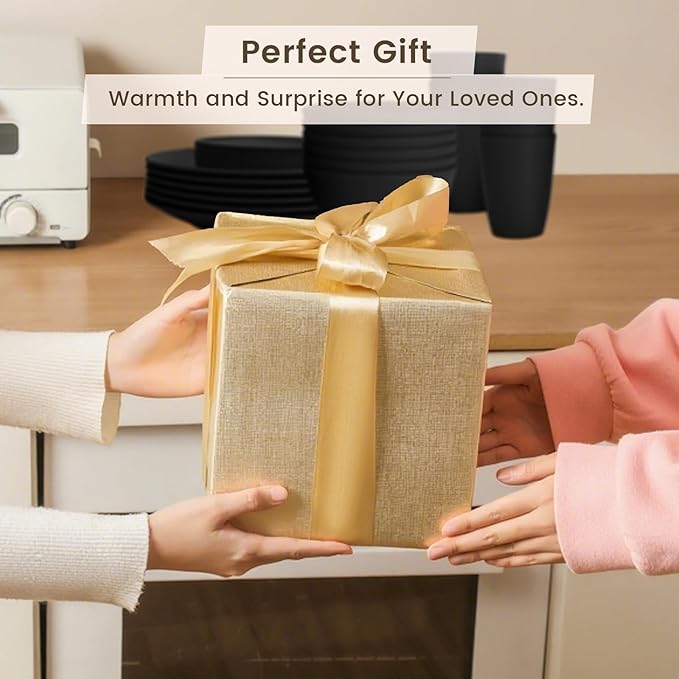 - GIFT FOR YOUR LOVED ONES: Our unique pattern design, smooth round edges, and classic black color design will impress your guests and elevate your dining experience. Each dish set includes 10'' dinner plates, 6'' wheat straw plates, 26 oz cereal bowls, and 12 oz cups, all beautifully packaged in gift boxes. Perfect for weddings, Christmas, housewarmings, and more, this reusable dinnerware set is a versatile and elegant choice.