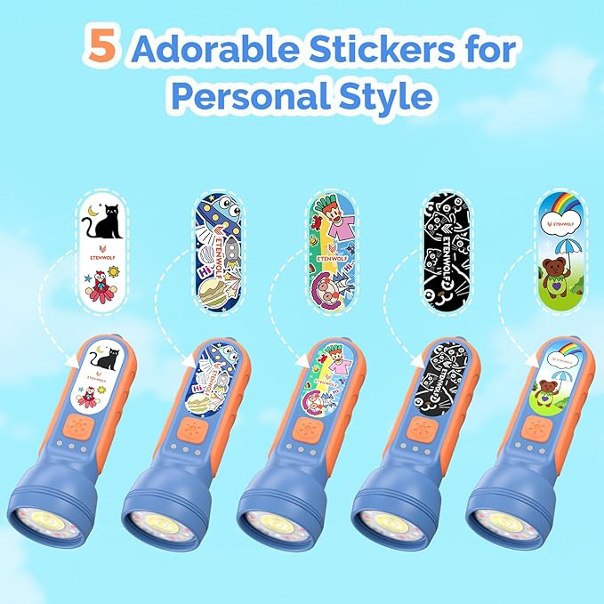 - Kid Friendly Design: The ETENWOLF L1 rechargeable flashlight features a soft silicone handle that is comfortable to hold, wear-resistant, and durable. It also comes with multiple original cartoon-style stickers that are easy to peel and stick, allowing kids to freely swap them based on their preferences, adding extra fun.It has an IPX5 waterproof rating, effectively protecting against splashes and water jets, making it an ideal choice for outdoor activities.
