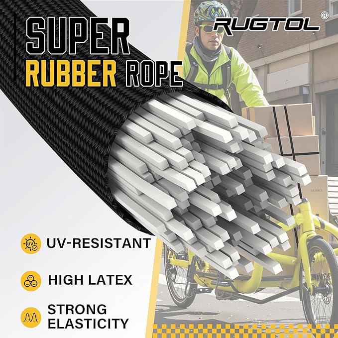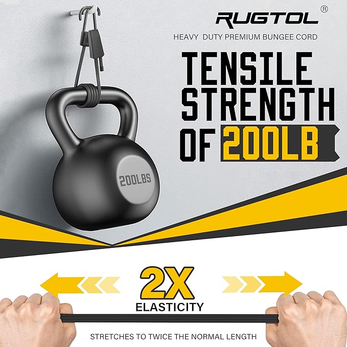 - Easy to Adjust Design Bungee Cords: Rugtol 12 Pack bungee cords are crafted with a premium blend of natural rubber and Thai latex, delivering exceptional elasticity that stretches up to twice their original length without compromising strength. The innovative adjustable mechanism makes it quick and easy to modify the length to suit your needs, eliminating the frustration of fixed-size cords.