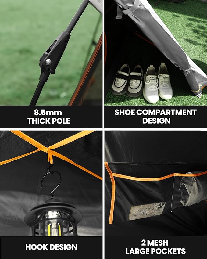 - Quick Pitch & Multiple Interior Storage Options: The camping tent is super easy to put up and take down thanks to pre-attached poles. There is an eyelet at the top of the tent so you can attach a lantern and two side pockets for stowing smaller needed items like a headlamp, cell phone, car keys and so on. The camping tent designed with a shoe storage area to prevent the generation of unpleasant odors inside the tent