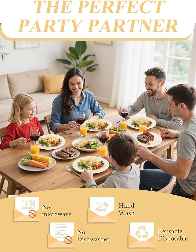 - Premium Durability: Made from 100% food-grade plastic, these elegant ivory disposable plates undergo rigorous safety testing, ensuring they’re entirely free of BPA, toxins, and harmful substances. Crafted for resilience, the high-quality material boasts exceptional sturdiness, making them a reliable, healthy choice for daily meals or lavish gatherings alike.