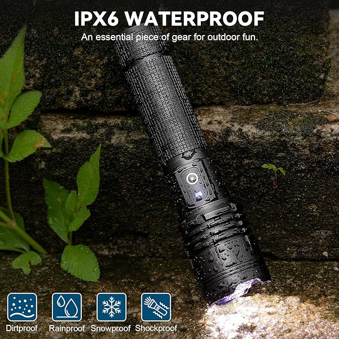- IPX7 Waterproof - Kmivo outdoor flashlight has a perfect sealed design and good waterproof performance. It can be used normally in heavy rain, snow and other harsh weather conditions.