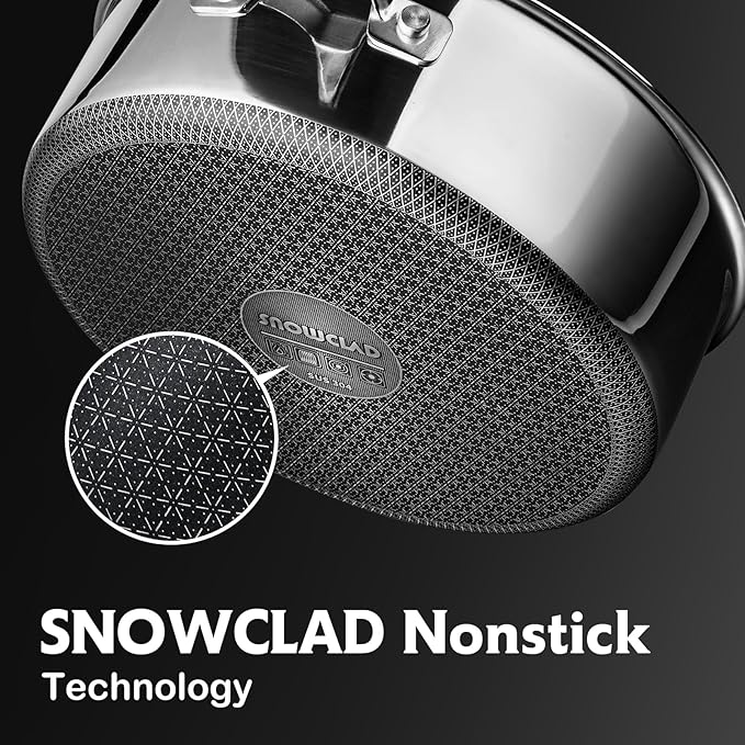 - 【SNOWFLAKE TECHNOLOGY】Our design is created through a laser etching process to provide both stainless steel and non stick surface. This dual surface allows to cook with less oil, grease, and butter.Our clad surface is 50% more than usual Hex surface non stick frying pans.