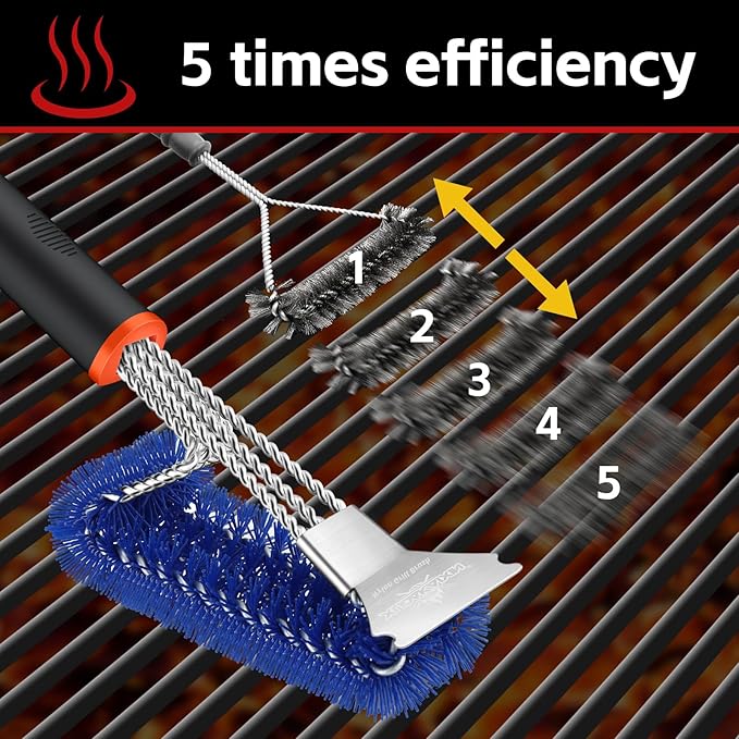 - 【5x Faster Cleaning 】 Three times more bristles than the traditional bbq grill brush, paired with razor-sharp durability and smart lateral flex. Effortlessly dominate stubborn buildup in hard-to-reach edges, corners, and grooves—all in one sweep. Engineered for speed and precision, this powerhouse cleaner gets the job done 5x faster than ordinary brushes, transforming grimy grates to spotless in seconds. Spend less time scrubbing, more time savoring grill season!