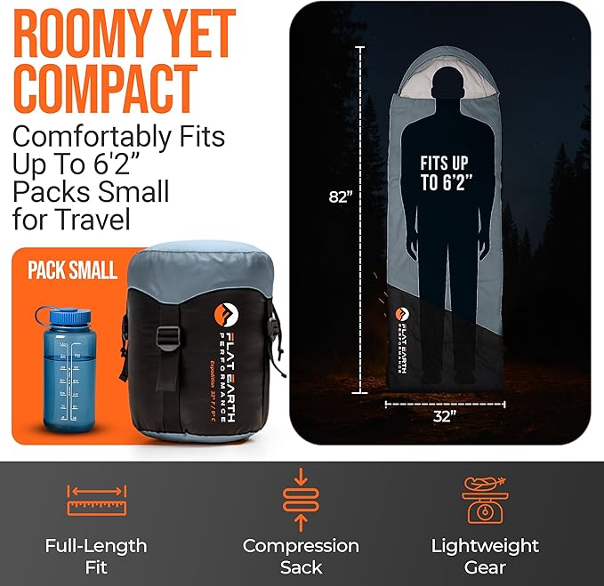 - Packs Small, Fits Tall – This compact sleeping bag compresses tight with a dual-buckle sack for easy packing, yet still opens to a full 82" length—ideal for men and women up to 6’2”. The Expedition sleeping keeps weight down without sacrificing comfort or space.