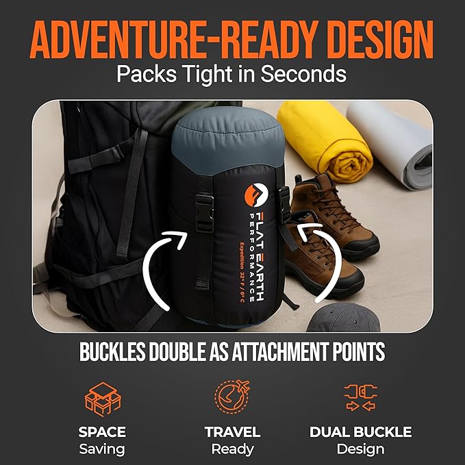 - Upgraded Compression Sack – Most camping sleeping bags include a simple cinch sack. Ours adds two compression buckles so you can fully tighten the pack-down—cutting bulk for easier transport in a car, kayak, or hiking pack.