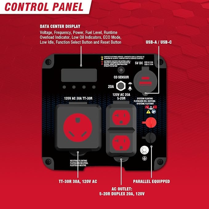 - Built-in safety and expandability: With our built in CO sensor this unit is equipped with automatic shutdown for safety, low oil protection, and a digital data center for real-time monitoring. Parallel-ready ports make it easy to connect a second generator if you need more power down the road.