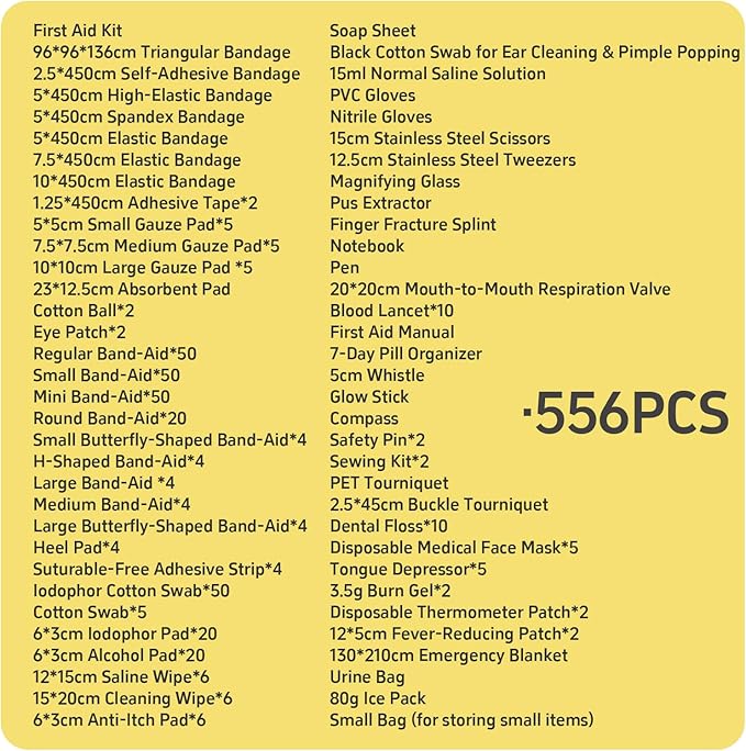 - 556 All-Inclusive Pieces for Comprehensive Emergency Needs ✅ This large first aid kit covers every emergency scenario: from minor cuts (with various bandages, gauze, and alcohol pads) to trauma care (hemostats, trauma pads) and roadside rescue (whistle, flashlight, emergency blanket). 556 pieces ensure you’re prepared for home accidents, car breakdowns, sports injuries, or camping trips—no need to buy extra supplies!