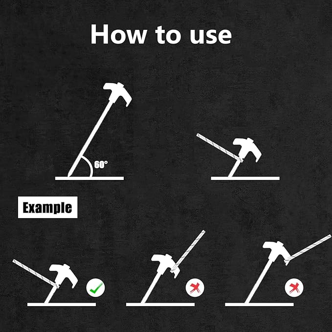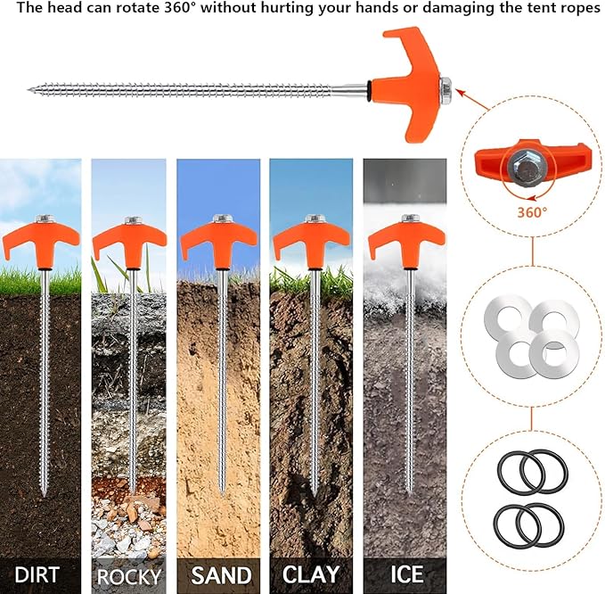- 【Simple Installation】These screw in tent stakes with pointed tips is easy to insert into the grass, dirt, hard soil, and gravel. The metal threaded tent spikes offer a stronger grip in windy conditions. With the help of a cordless drill or impact driver, ground anchors will make your tents, canopy, awning, tarps, and grasp the ground more stable and reliable.