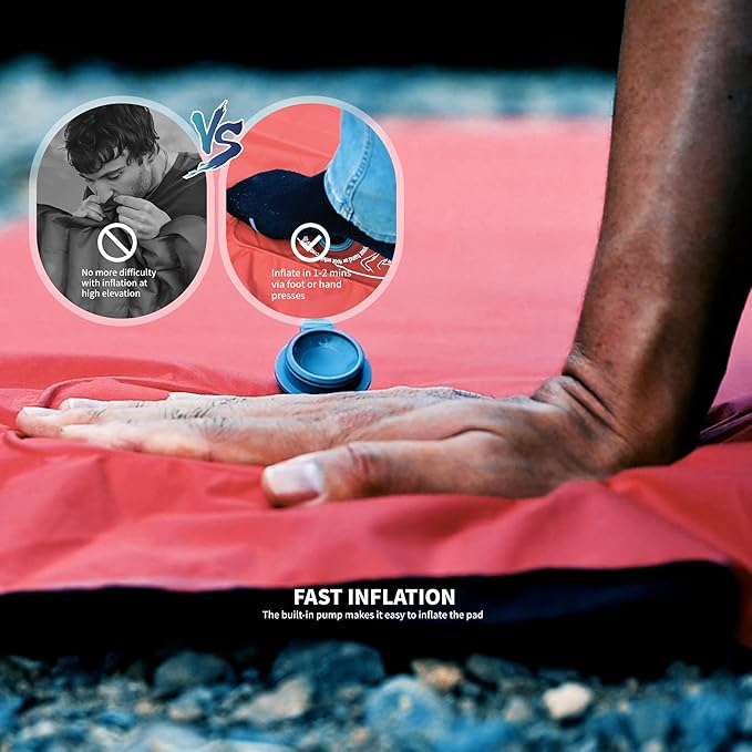- ✅FAST INFLATION w/ BUILT-IN PUMP - Inflate this camping mattress in 2-3 mins via foot/hand presses—no extra pumps or batteries needed. The built-in pump features a one-way valve to prevent backflow, plus a two-stage deflation system for easy firmness adjustment and quick packing. Faster setup than standard pads for hassle-free camping.