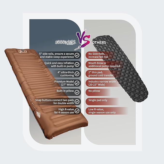 - Special Feature : 4" thick body zone protects from rough, hard and cold, Ergonomic Designed 6.3" pillow and 5" edge plush for ease neck & back strain, Fast inflation/deflation with built-in foot pump, The snap buttons allow you to connect pads together, Wider than standard, eliminates crampedness 4" thick body zone protects from rough, hard and cold, Ergonomic Designed 6.3" pillow and 5" edge plush for ease neck & back strain, Fast inflation/deflation with built-in fo… See more