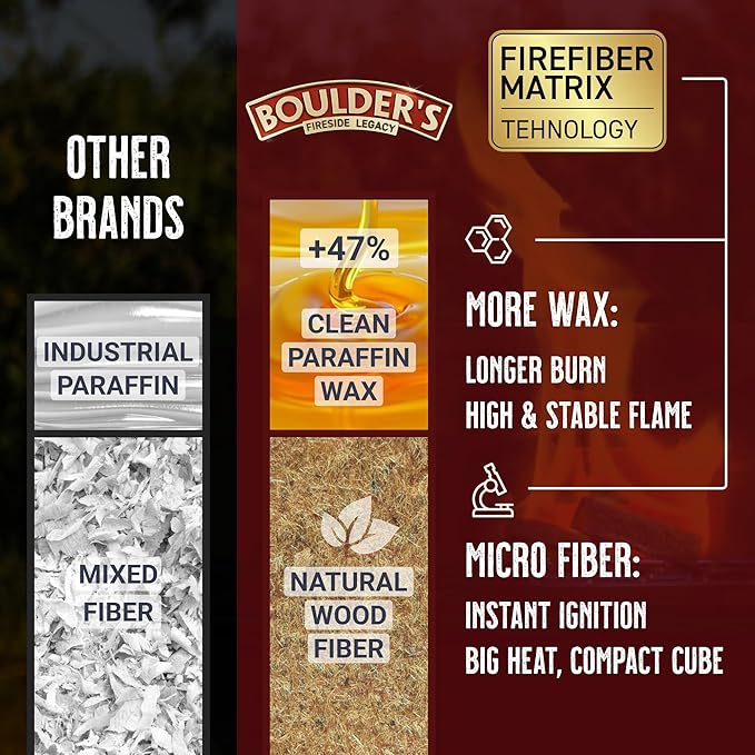 - ADVANCED FIREFIBER MATRIX TECHNOLOGY - Proprietary blend of wax and microfiber delivers instant ignition and high flame. Reliable for fireplaces, fire pits, grilling, cooking, camping, and survival fire starter kits.