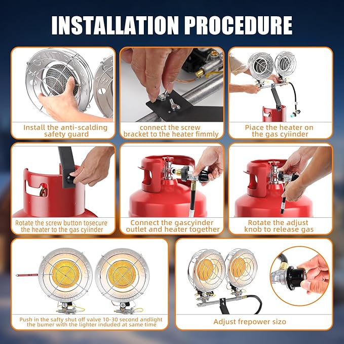 - Three Adjustable Settings: -- This outdoor propane heater features three adjustable settings (Low/Medium/High) with a heating range from 9,000 to 30,000 BTU, delivering exceptional temperature control. Designed as a propane heater for camping, its installation process is extremely simple and straightforward, making it ideal for various outdoor heating needs