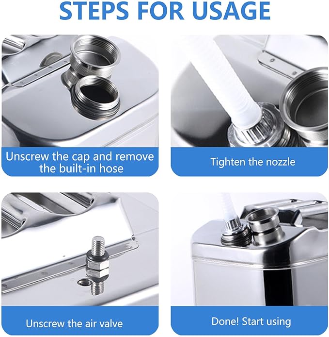 - Accessories: Each stainless steel can is equipped with a flexible hose, the interface is made of aluminum, and the hose itself is made of professional PET material. This makes it more convenient and flexible to introduce liquid into the device. When in use, align the hose with the can mouth and pour the liquid easily.