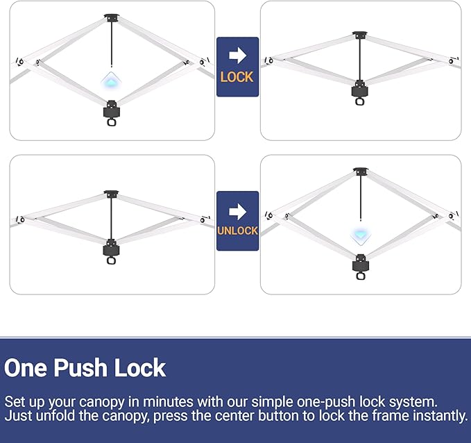 - One Push Lock, Two person setup - Set up your canopy in minutes with our simple one-push lock system. Just unfold the canopy, press the center button to lock the frame instantly, then adjust the legs to your preferred height to complete it.Adjust between three heights smoothly using pinch-free buttons, so you can adapt to different sun conditions.