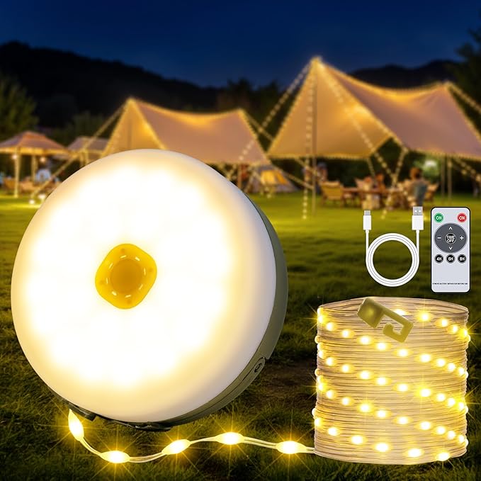 - ๐9 Lighting Modes & Timer: Camping lights string provides 3 levels of brightness, and 6 light modes (Warm White String Light, Alternating Flash, Breathing Flash, Camping Lantern, SOS flash, Camping Lantern + String Light)โmeeting different lighting needs. It also equipped with 2H/4H/6H timer function, no need to turn off manually after setting. Just long-press the power button to turn it off.