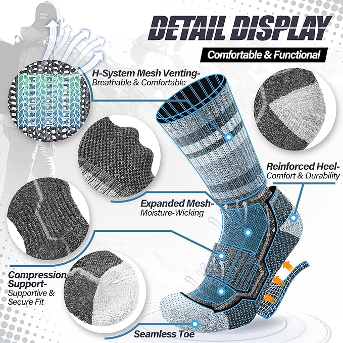 - Gentle Compression Support: With soft elasticity design and compression stripes along the calf and foot arch, these socks provide a snug, secure fit that keeps them in place. This helps your legs stay comfortable and supported, making them ideal for outdoor activities such as walking, running, climbing, and trekking