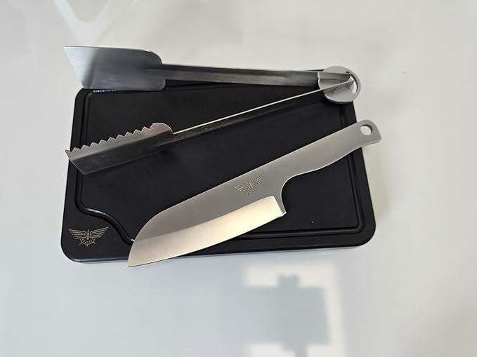 - All-in-one grill kit includes stainless steel grate, 1" cast iron pan, cutting board, scraper, spatula-tongs, silicone mat, and M19A1 ammo can. Built from 1/8" thick 304 stainless steel for long-lasting durability and high heat resistance. Compact design fits in a military-grade ammo can for easy transport and storage. Assembles in seconds—perfect for camping, tailgating, and outdoor cooking. Made in the USA with rugged materials built to last.