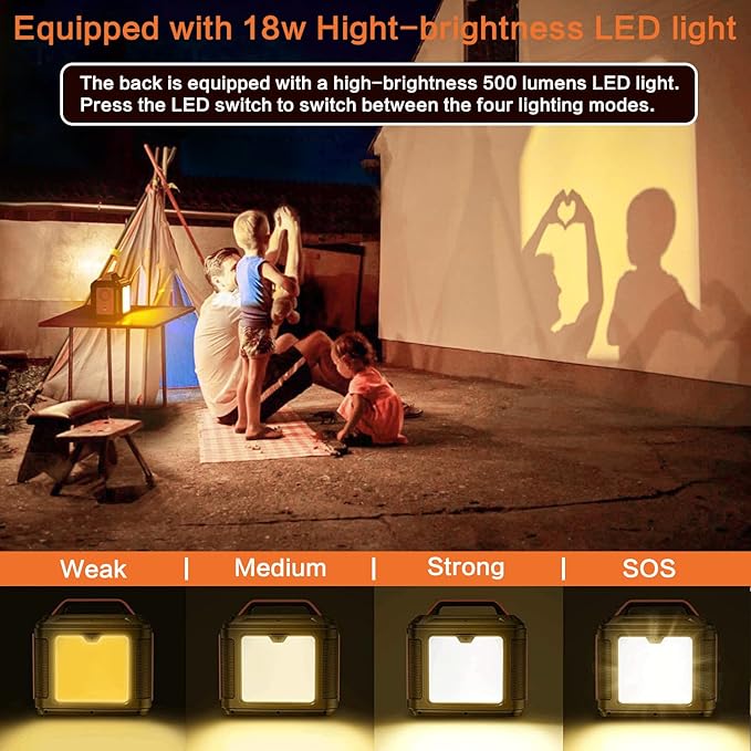 - 【Outdoor Backup Power】Designed lightweight-just 6.6 lbs and has a solid handle for easy to carry. Equipped with an 18W bright emergency flashlight on the back, which can project a powerful beam of up to 500 meters and is suitable for large-area lighting. It is perfect for outdoor camping and disaster prevention. There are 4 lighting modes you can easily switch (weak→medium→strong→SOS).