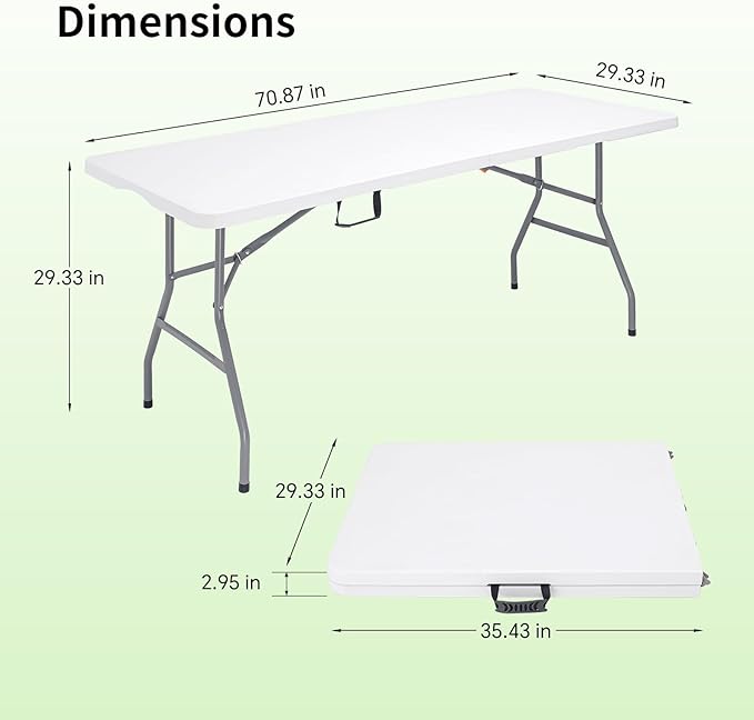 - Foldable & Portable - The unfolded size is 71" L x 29" W x 29" H. The folded size is 35.5" L x 29" W x 2.9" H. This 6-foot folding table can be easily folded up to store when not in use. It is big enough for almost any project, yet doesn't take up much floor space, and even an old person or a child can easily set it up by themselves. There is a comfortable handle on the table, which makes it more convenient to carry and fit in the car trunk