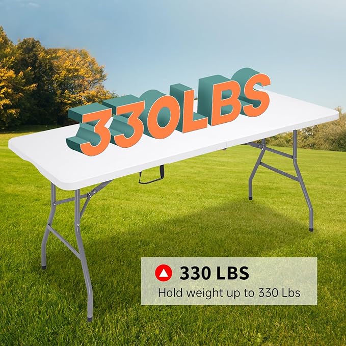 - Multi-purpose - This 6-foot folding table weighs only 27.8 pounds, very lightweight and easy to move. This portable rectangle table can be used for outdoor tables such as camping table, barbecue portable table, picnic table, and for indoor tables such as dining table, party table, game table, office table, banquet table, study table or as adesk. It requires no assembly and sets up or folds away in minutes, comfortably seating 6-8 adults