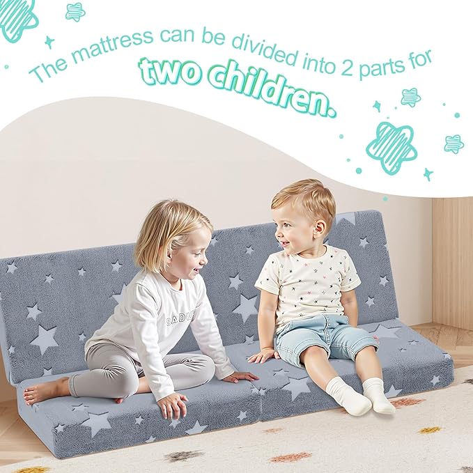 MeMoreCool Foldable Floor Mattress for Kids, Glow Toddler Nap Mat for Sleeping and Daycare, Portable Trifold Futon Mattress Floor Bed, Star
