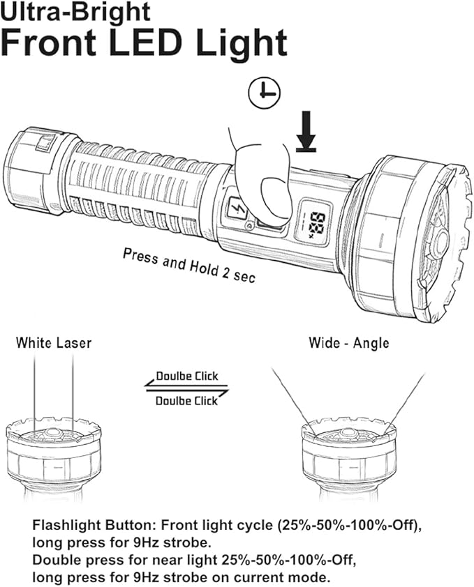 - 【BRIGHT FLASHLIGHT】Flashlights high lumens equipped with an LCD real-time battery level display, which provides a clear and accurate reading of the remaining flashlight battery power. Rechargeable flashlights is equipped with Upgraded Long Beam LED Chip. Switch between precision-focused white laser /8*XPG /wide-angle COB illumination for versatile use.